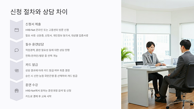 ๋ ์ ํ ๋ชจ๋ HRD-NET์์ ์จ๋ผ์ธ ์ ์ฒญ์ด ๊ฐ๋ฅํ์ง๋ง, ์ ์ฒญ ํ ์ ์ฐจ์ ์๋ด ๋ฐฉ์์์ ์ฐจ์ด๊ฐ ์์ด์.